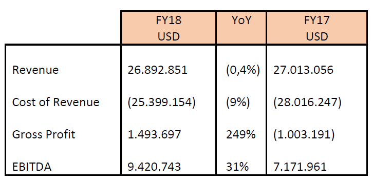 The Management continues in success to maintain and keep efficient operations especially in the indirect costs, thereby is able to keep pushing reduction from USD 4.3 million to USD 3.9 million in FY18 or dropped by 9% YoY.