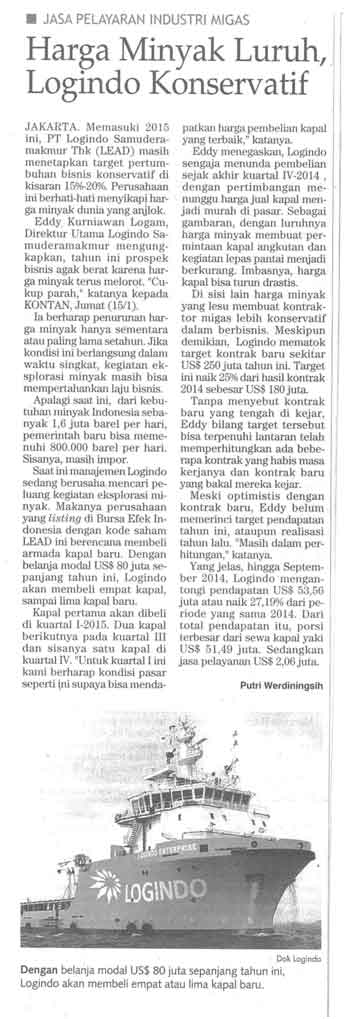 JAKARTA. Memasuki 2015 ini, PT Logindo Samudramakmur Tbk (LEAD) masih menetapkan target pertumbuhan bisnis konservatif di kisaran 15%-20%. Perusahaan ini berhati-hati menyikapi harga minyak dunia yang anjlok.