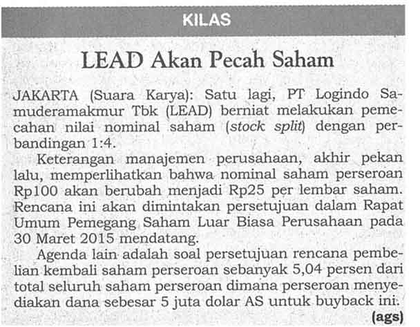 JAKARTA (Suara Karya): Satu lagi, PT Logindo Samudramakmur Tbk (LEAD) berniat melakukan pemecahan nilai nominal saham (stock split) dengan perbandingan 1:4.